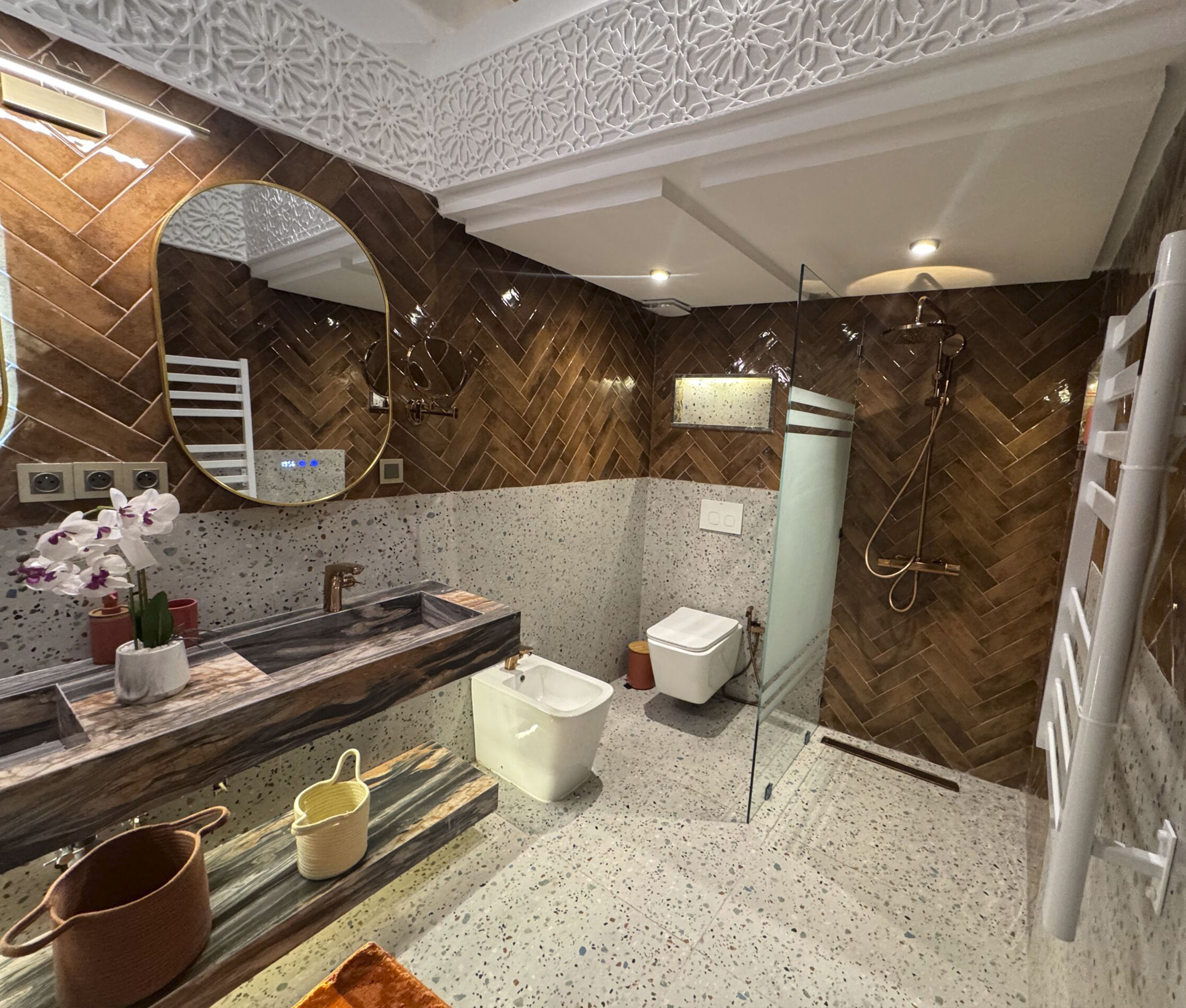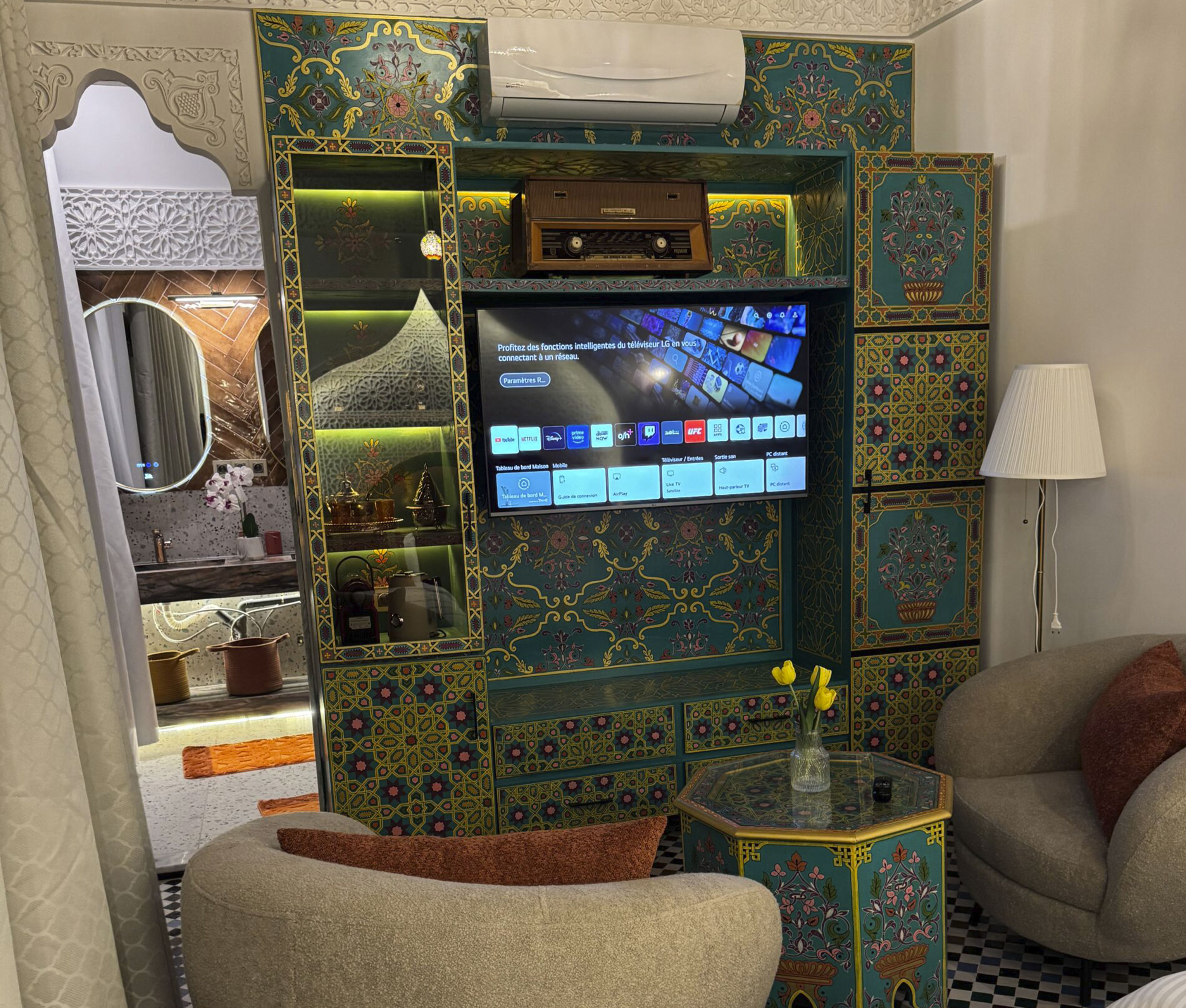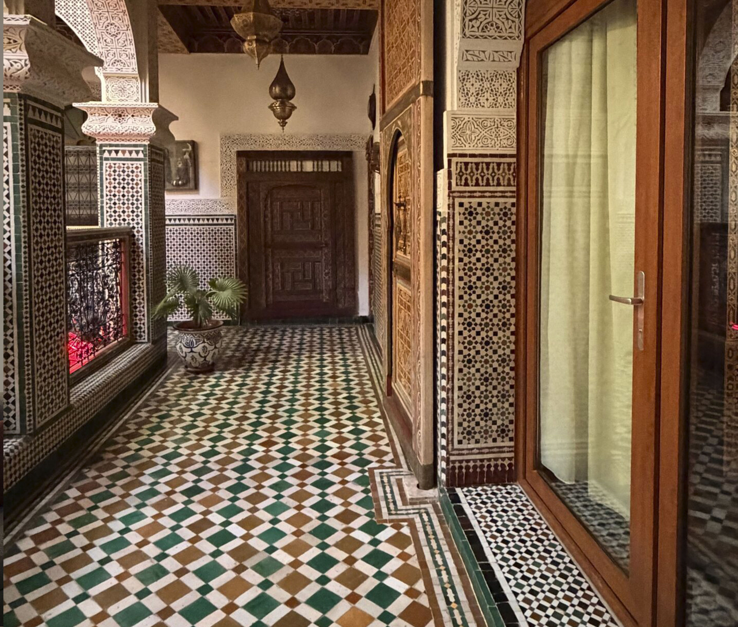 The walls are made of traditional plaster, the floors are covered with authentic Fez zellige, and the ceiling is crafted from oak wood decorated with Amazigh Berber motifs dating back to the 12th century