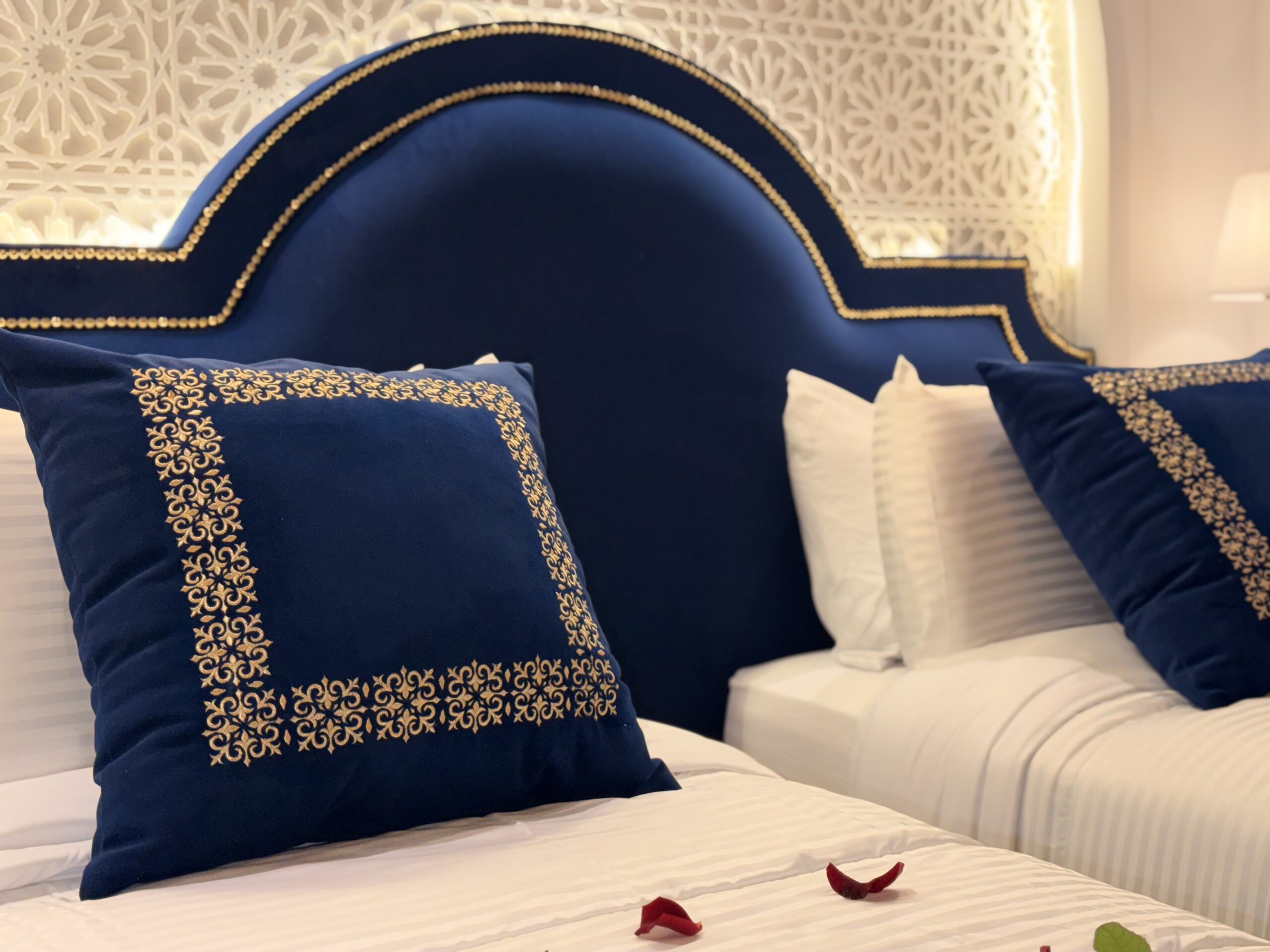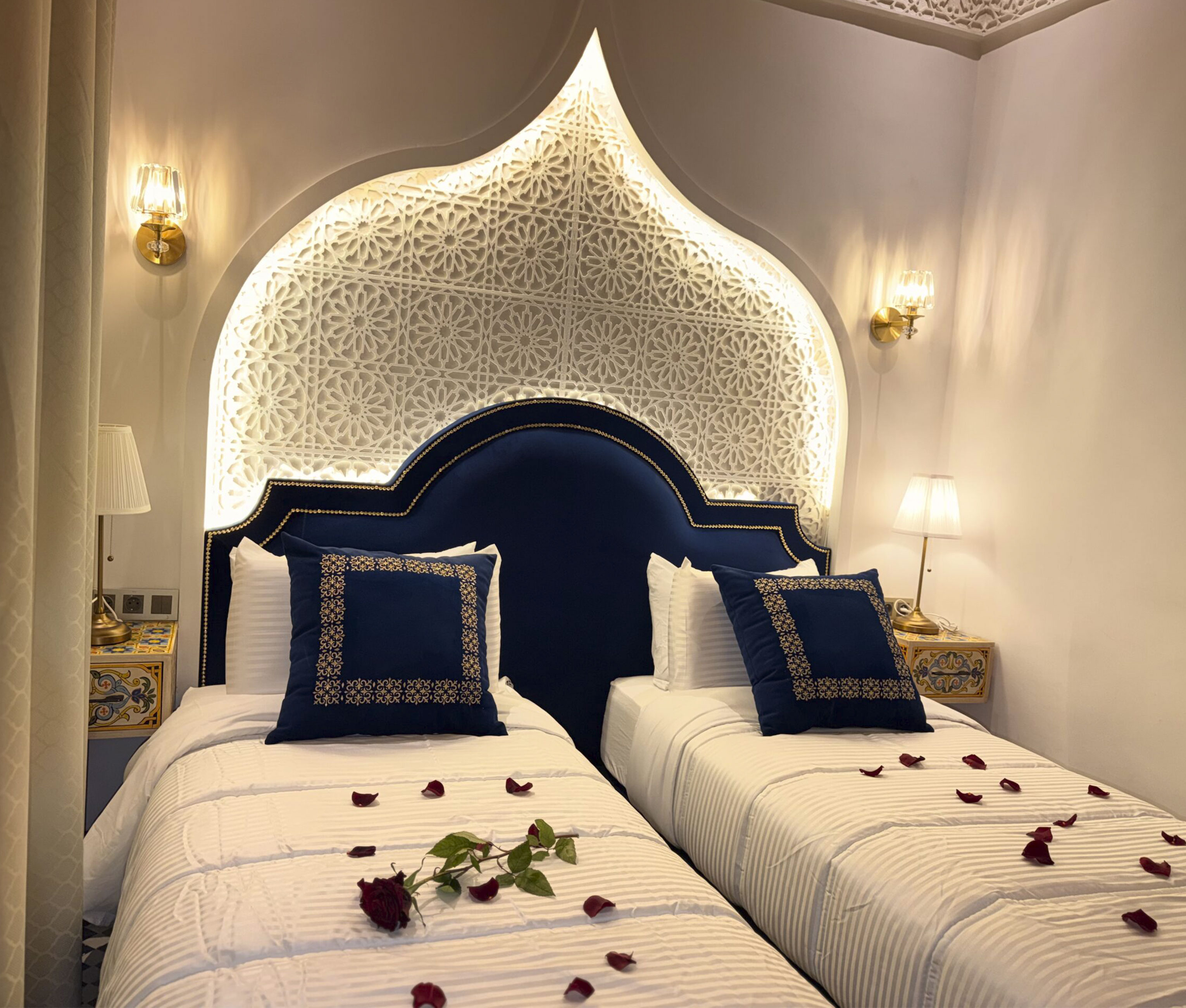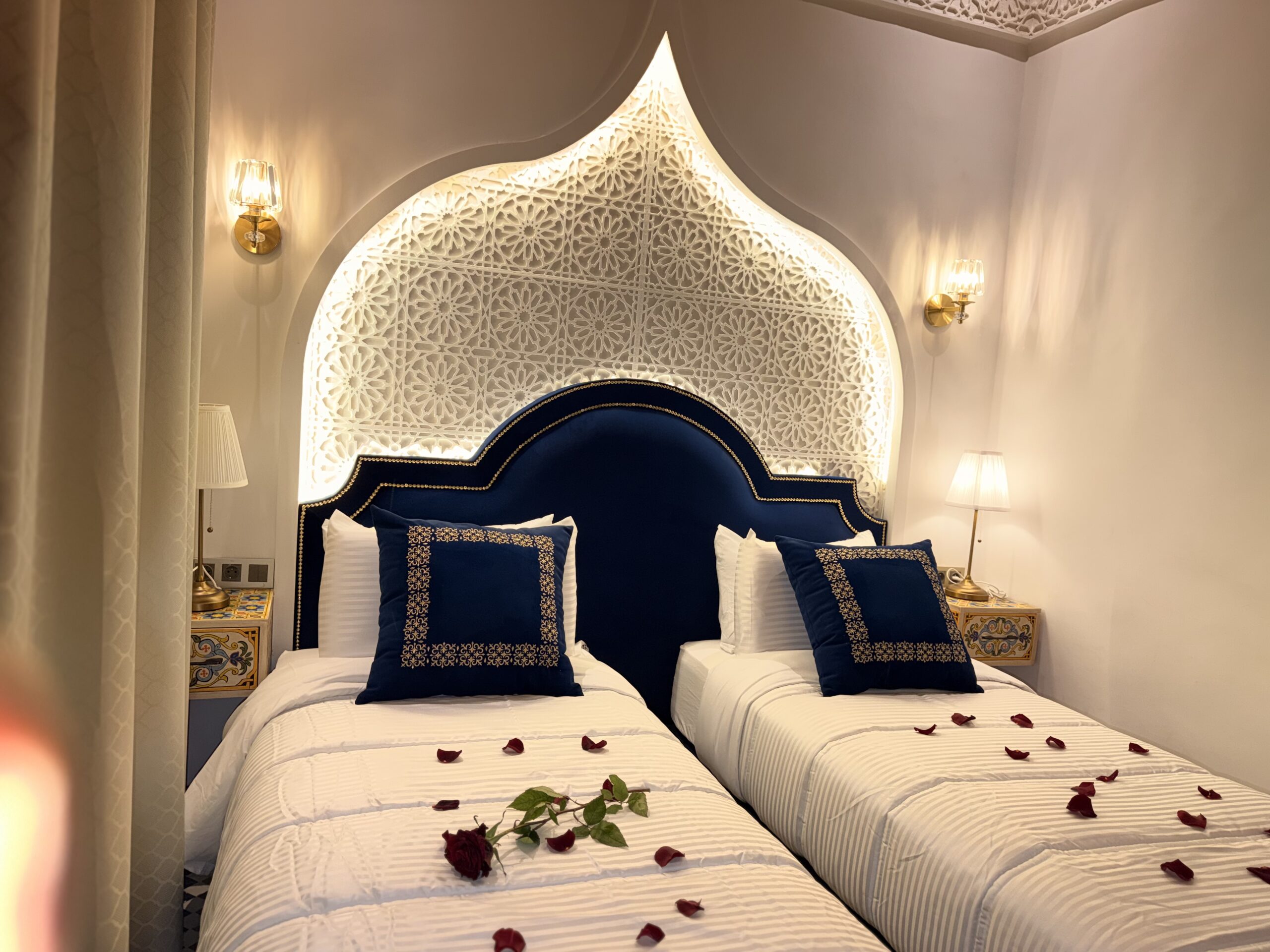 The Azure room is located on the second floor of the Riad Palais Bab Sahra. It can be accessed via the 14th-century medieval staircase. It can also be accessed by the elevator, One large window offers a magnificent view of the Palais courtyard, and it is fitted with a large glass door to prevent noise from entering while allowing natural sunlight to flow into the room. A smaller window overlooks There is also an additional window in the bathroom that looks onto the interior courtyard of Riad Palais Bab Sahara .
