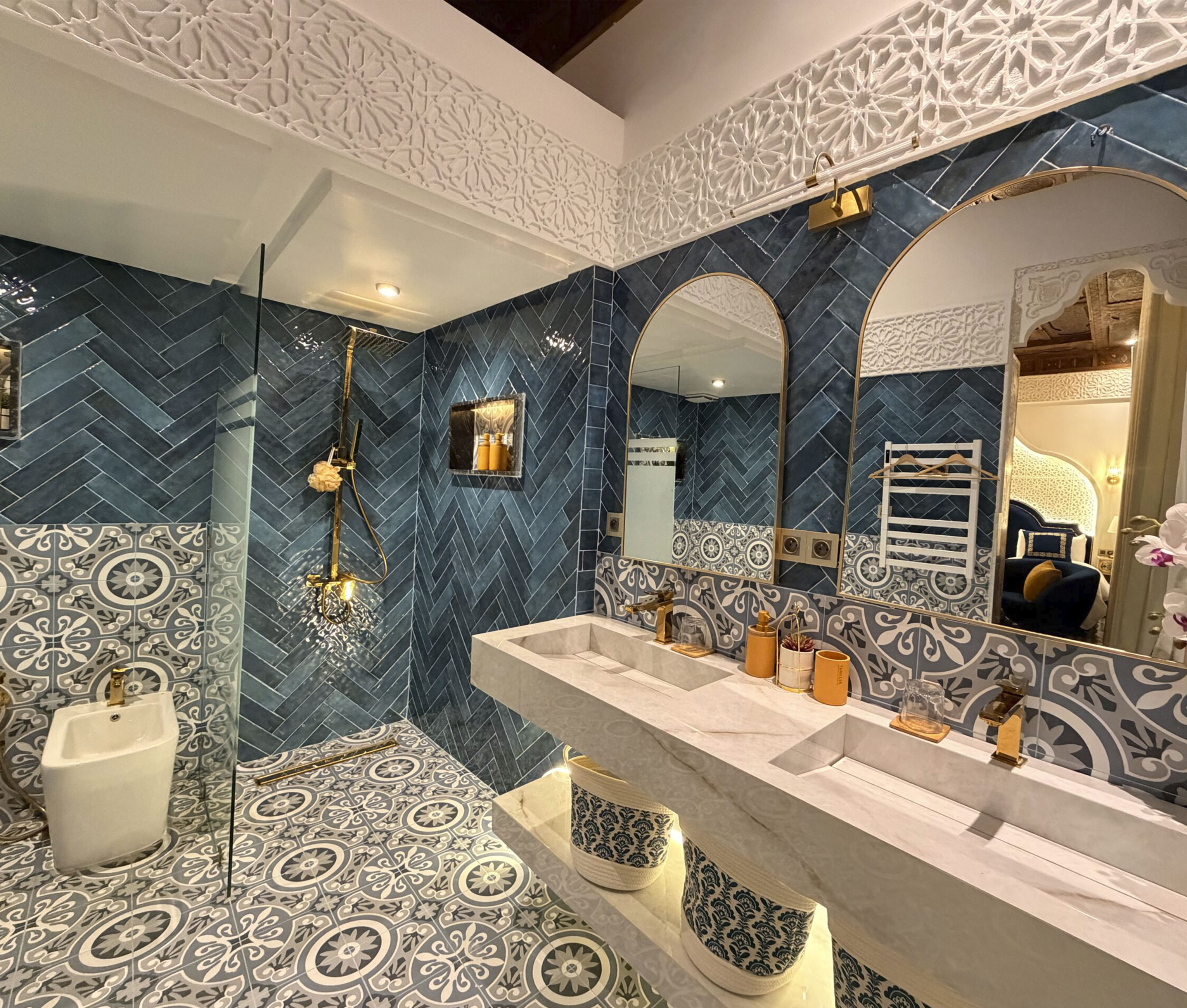 The bedroom has a 180 x 200 cm bed (no extra bed possible) and a period wardrobe, beautifully decorated with traditional Fez naqqash fassi hand-painted motifs in classic colors, The bathroom has a large walk-in shower measuring 280 x 200 cm, an antique washbasin and WC.