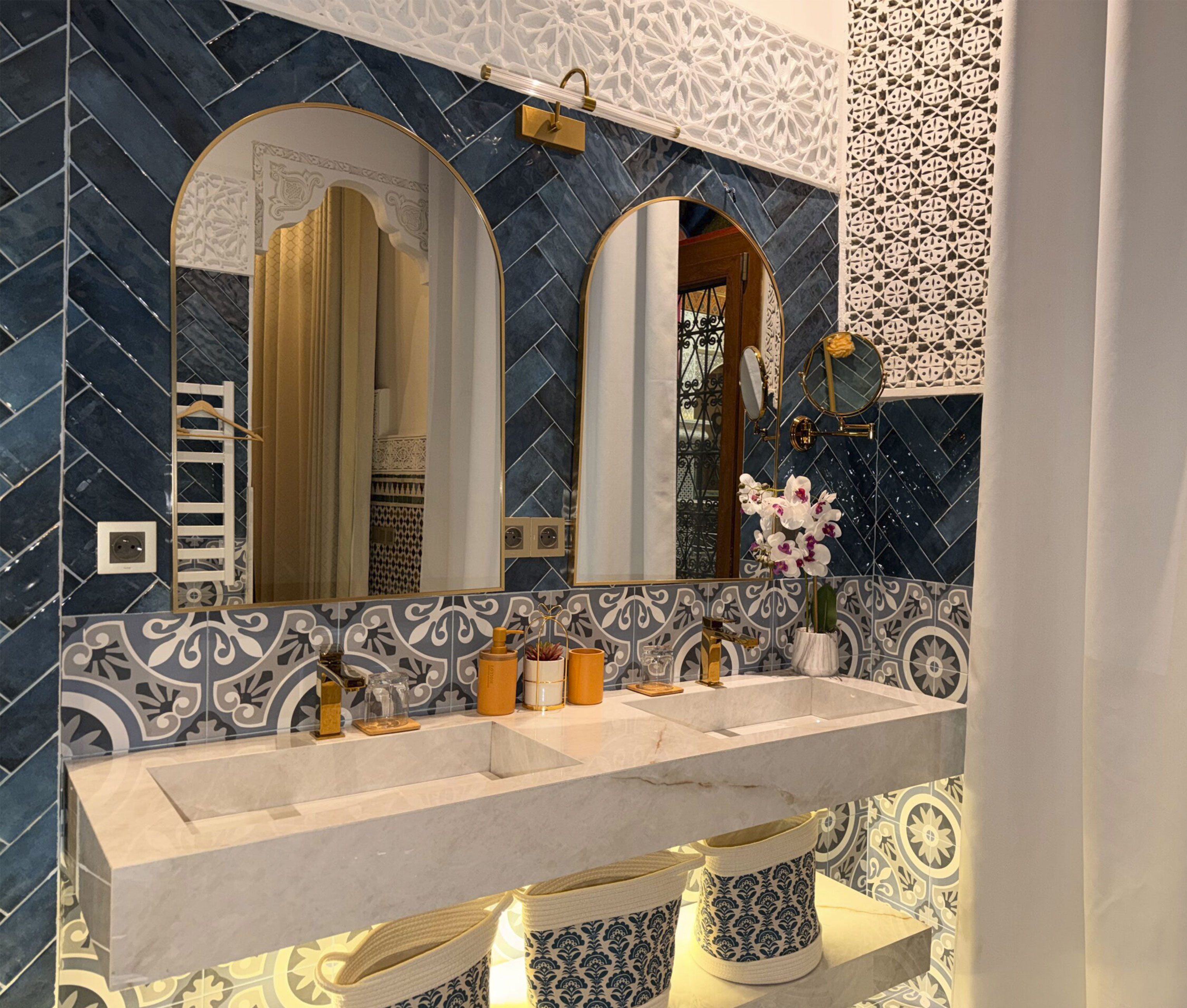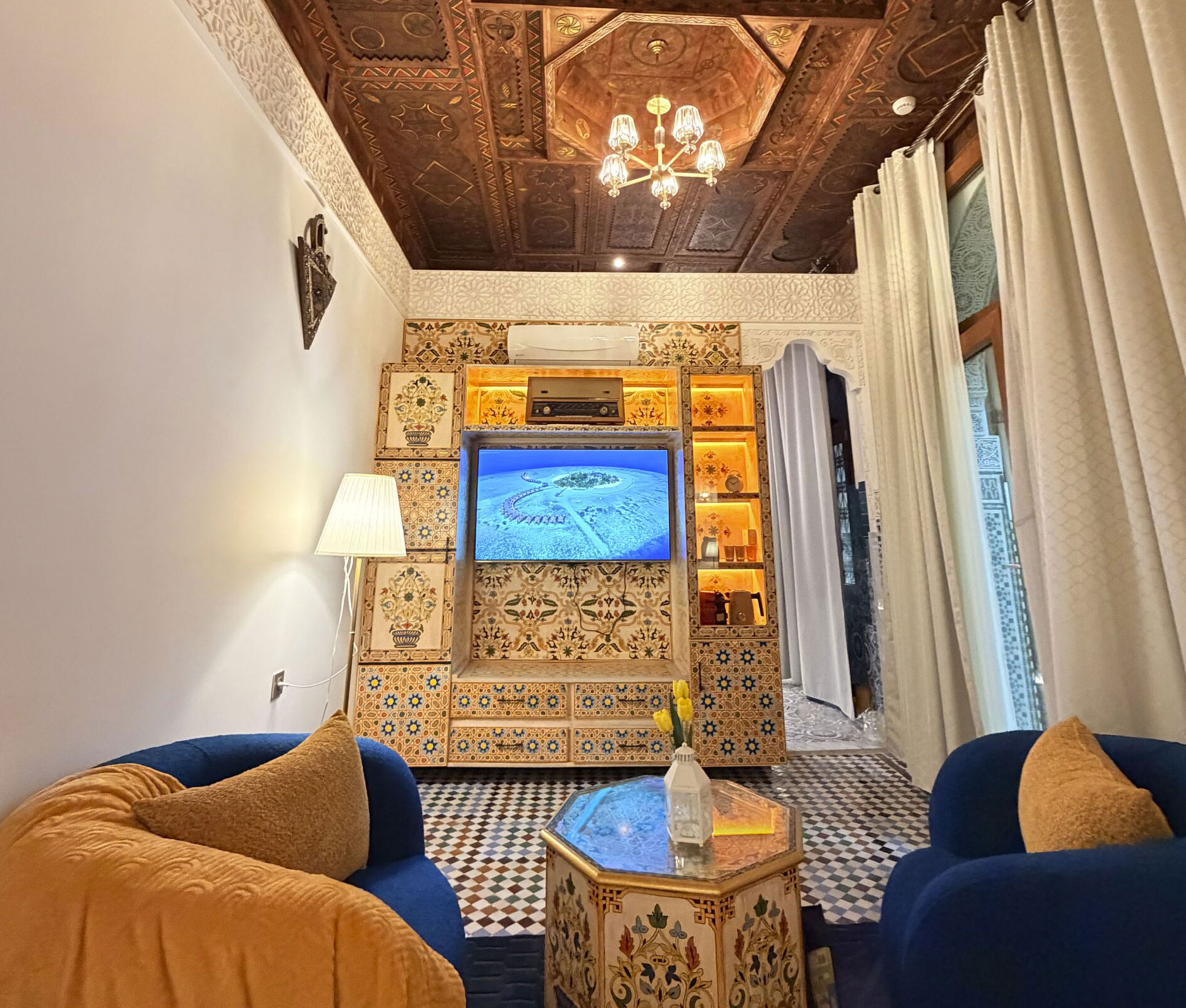 The walls are made of traditional plaster, the floors are covered with authentic Fez zellige, and the ceiling is crafted from oak wood decorated with Amazigh Berber motifs dating back to the 12th century