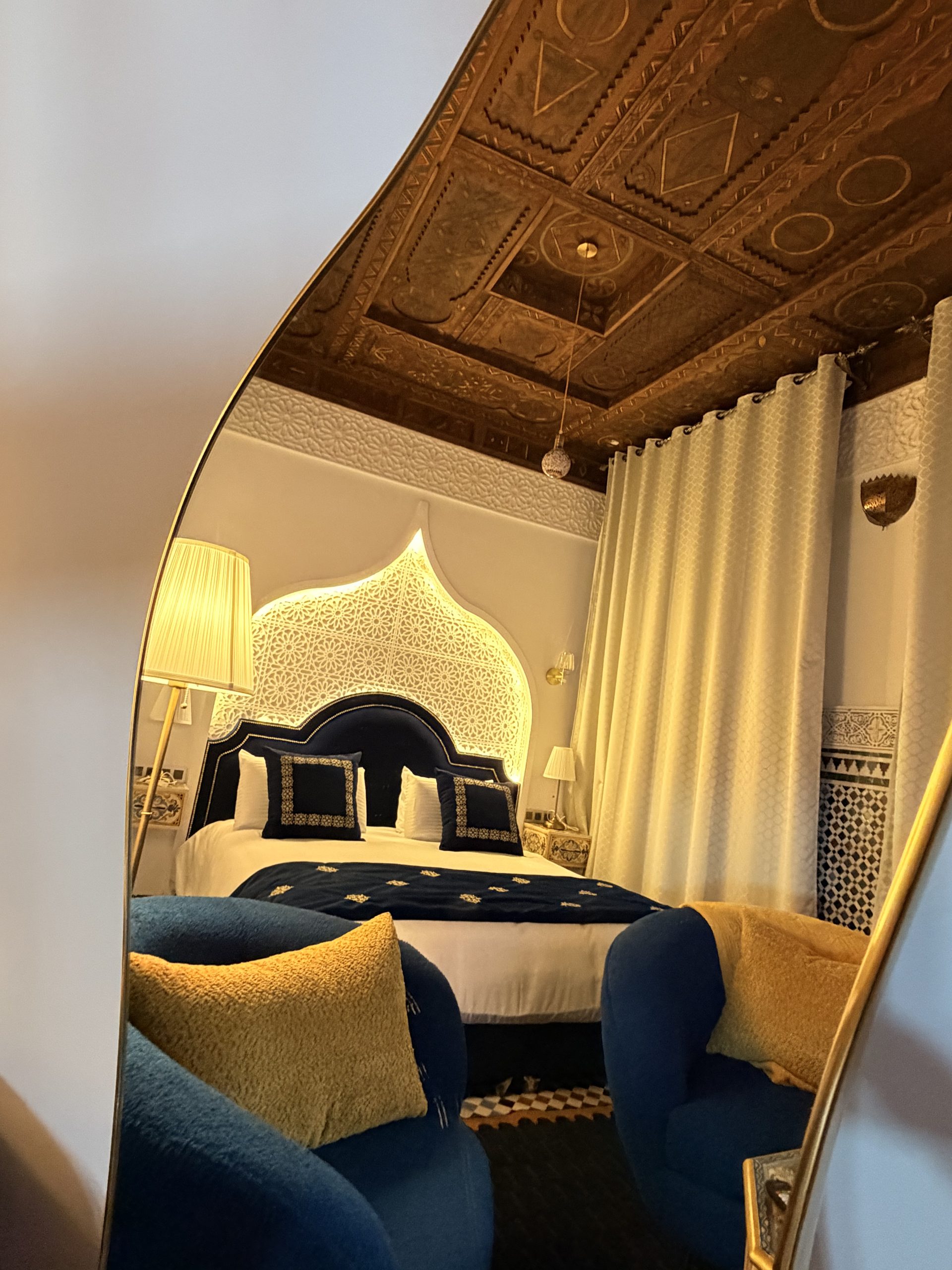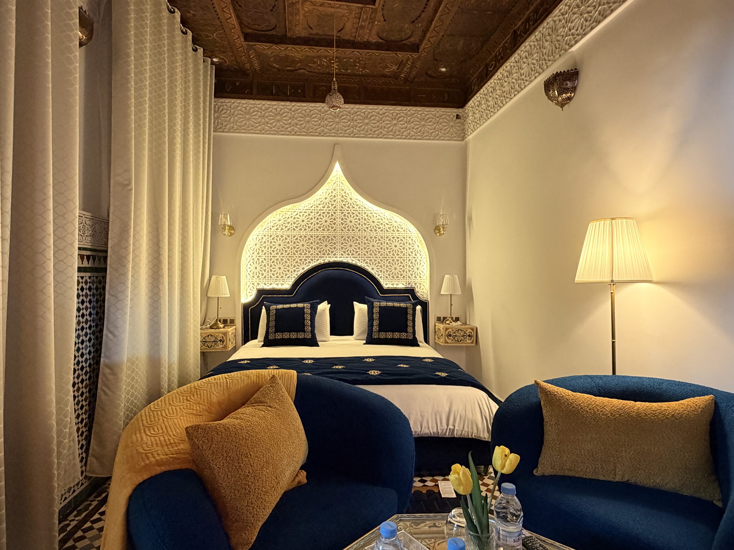 The Azure room is located on the second floor of the Riad Palais Bab Sahra. It can be accessed via the 14th-century medieval staircase. It can also be accessed by the elevator, One large window offers a magnificent view of the Palais courtyard, and it is fitted with a large glass door to prevent noise from entering while allowing natural sunlight to flow into the room. A smaller window overlooks There is also an additional window in the bathroom that looks onto the interior courtyard of Riad Palais Bab Sahara .