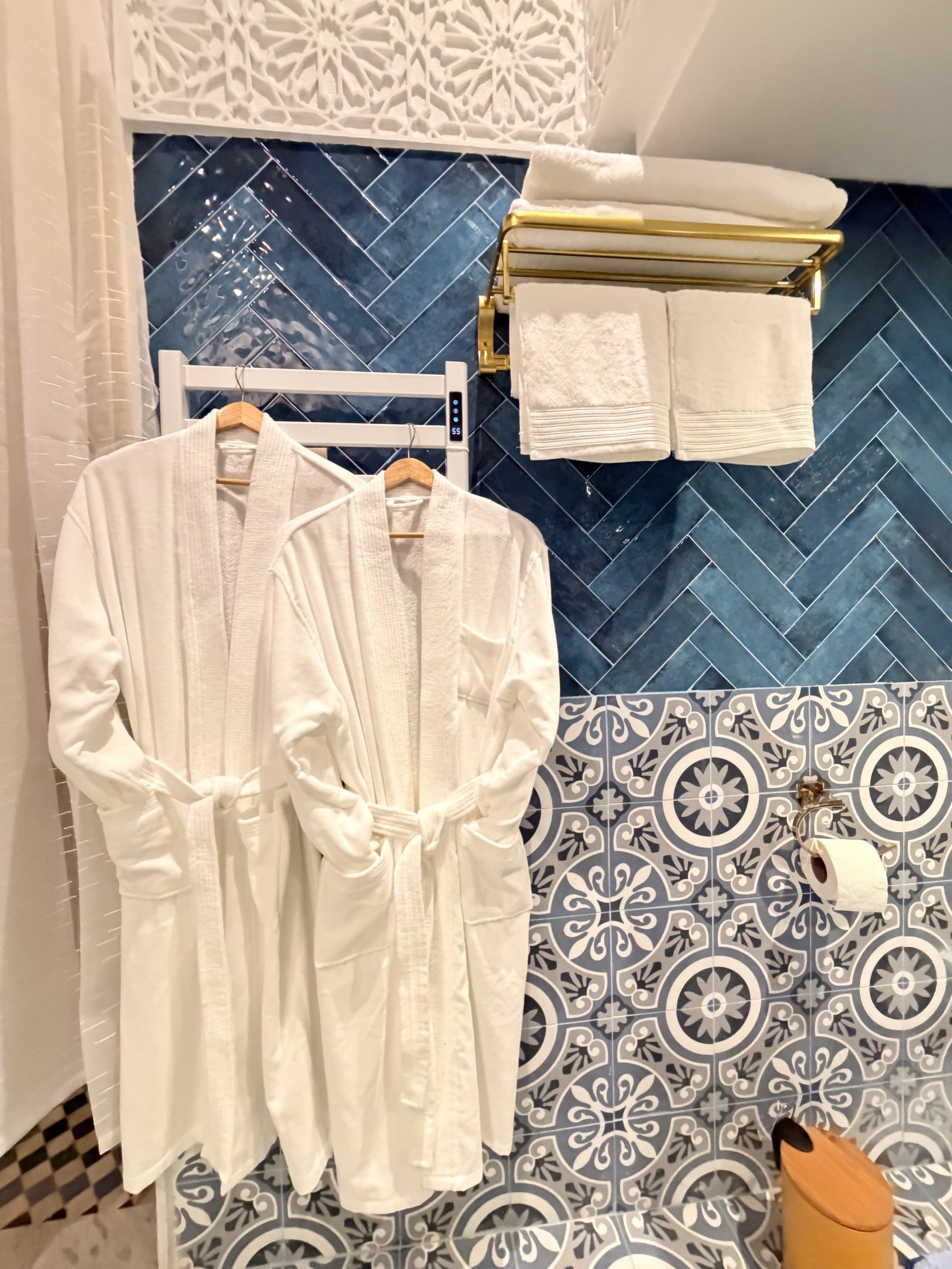 The bedroom has a 180 x 200 cm bed (no extra bed possible) and a period wardrobe, beautifully decorated with traditional Fez naqqash fassi hand-painted motifs in classic colors, The bathroom has a large walk-in shower measuring 280 x 200 cm, an antique washbasin and WC.