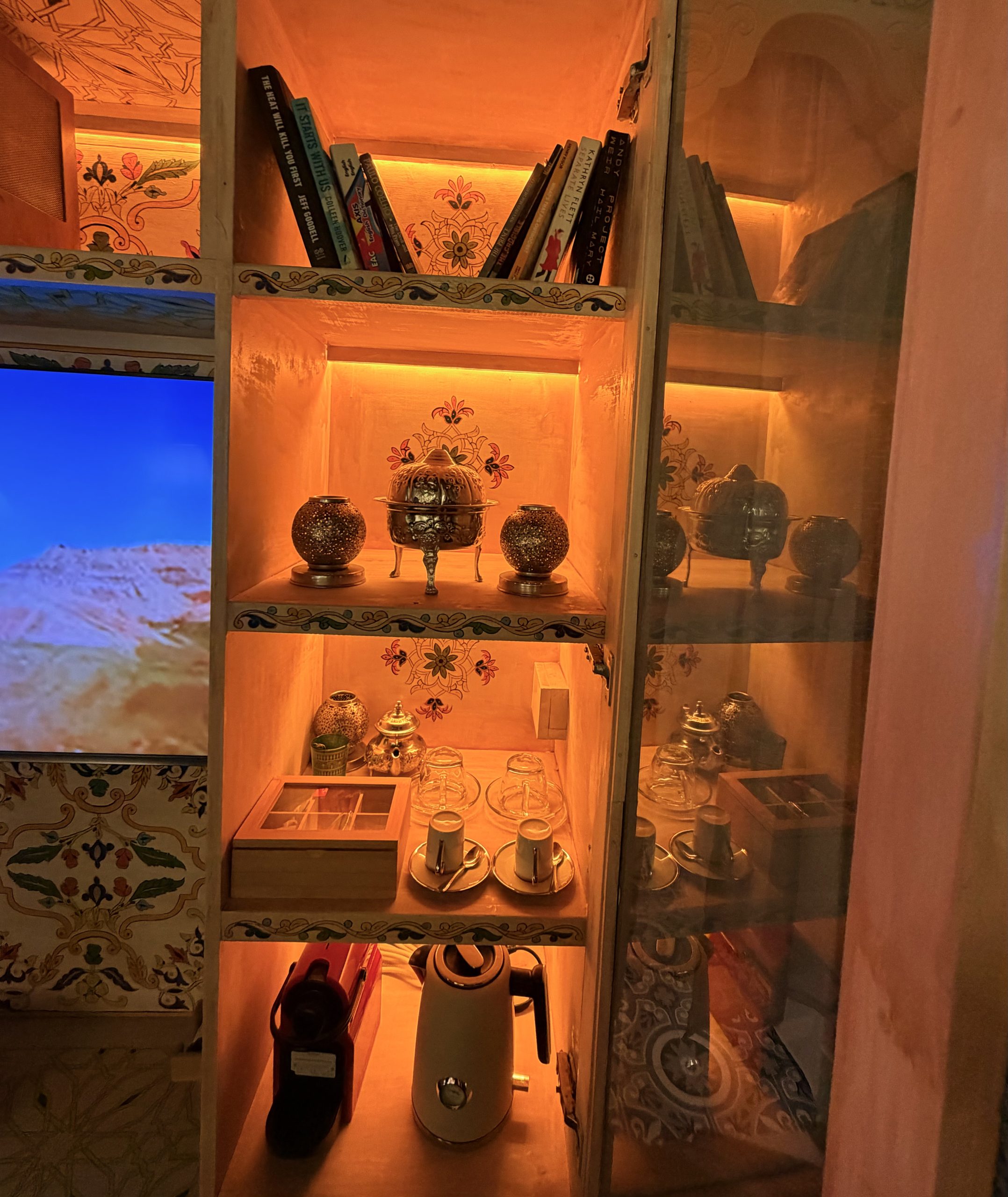 The walls are made of traditional plaster, the floors are covered with authentic Fez zellige, and the ceiling is crafted from oak wood decorated with Amazigh Berber motifs dating back to the 12th century