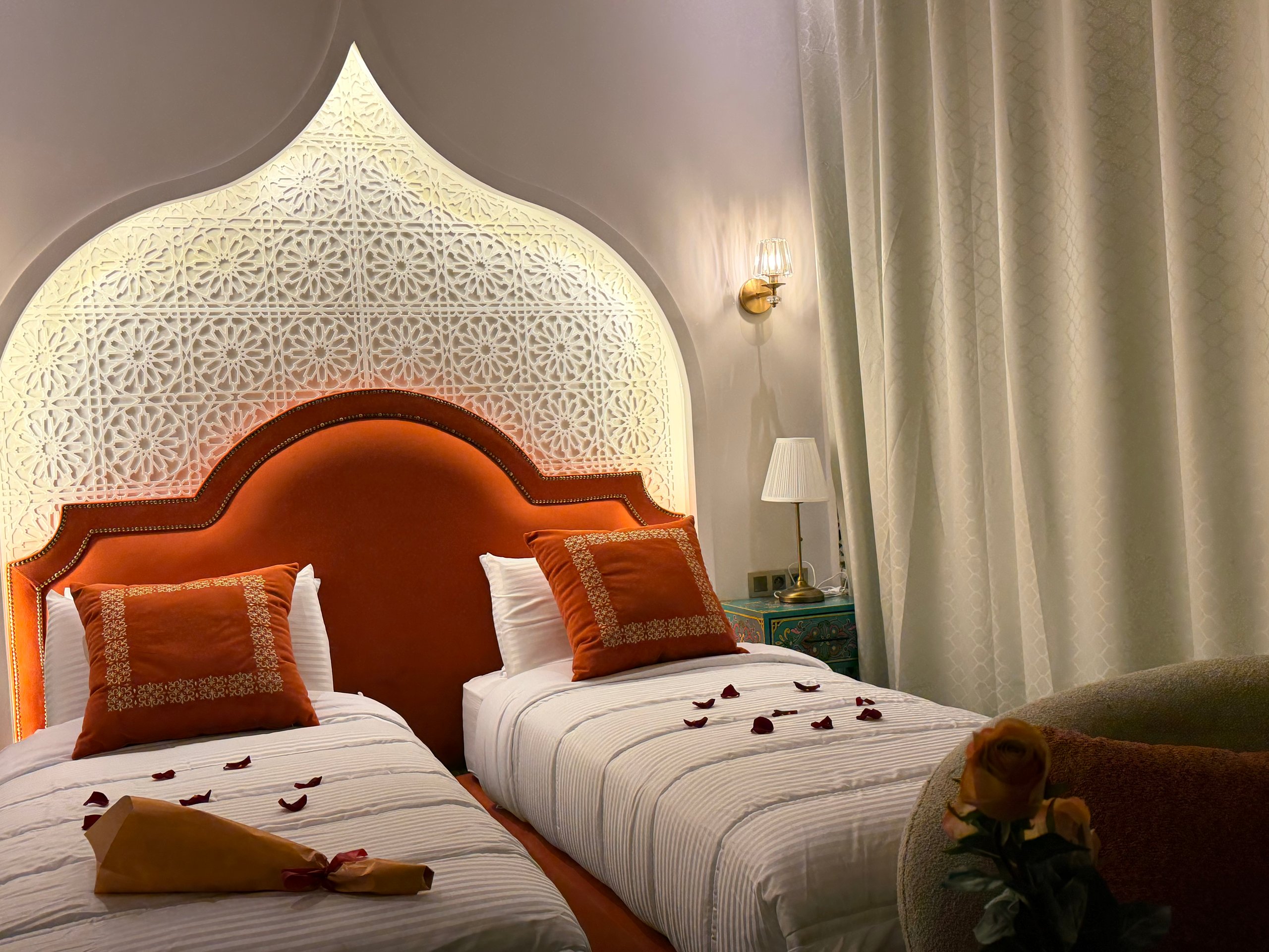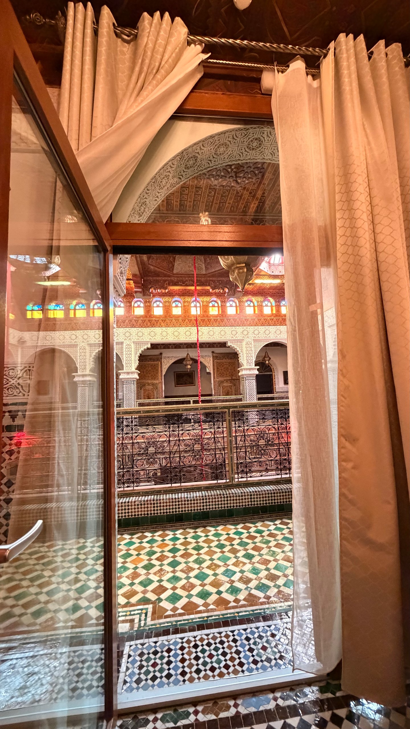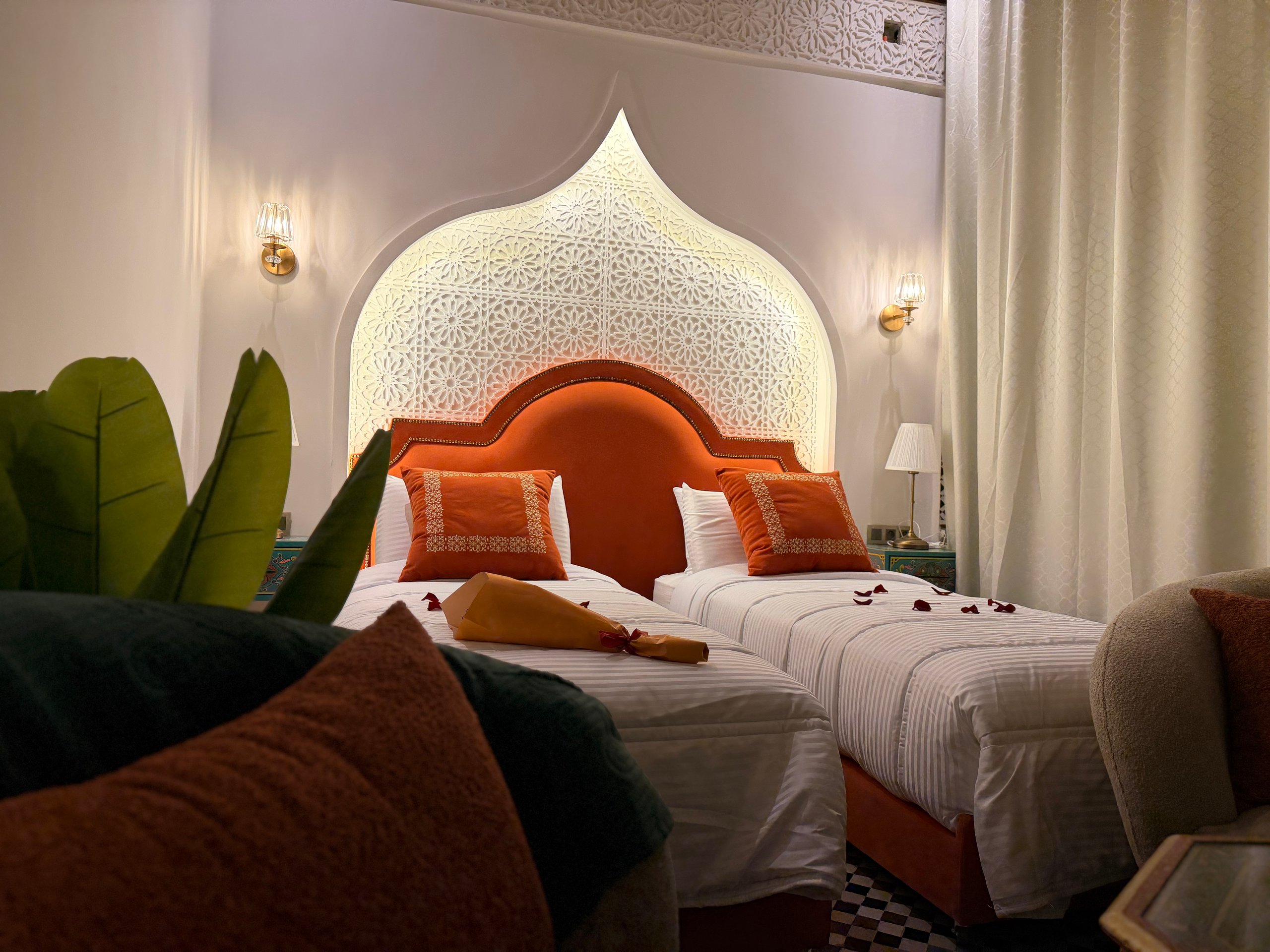 The Amber room is located on the second floor of the Riad Palais Bab Sahra. It can be accessed via the 14th-century medieval staircase. It can also be accessed by the elevator, One large window offers a magnificent view of the Palais courtyard, and it is fitted with a large glass door to prevent noise from entering while allowing natural sunlight to flow into the room. A smaller window overlooks There is also an additional window in the bathroom that looks onto the interior courtyard of Riad Palais Bab Sahara .