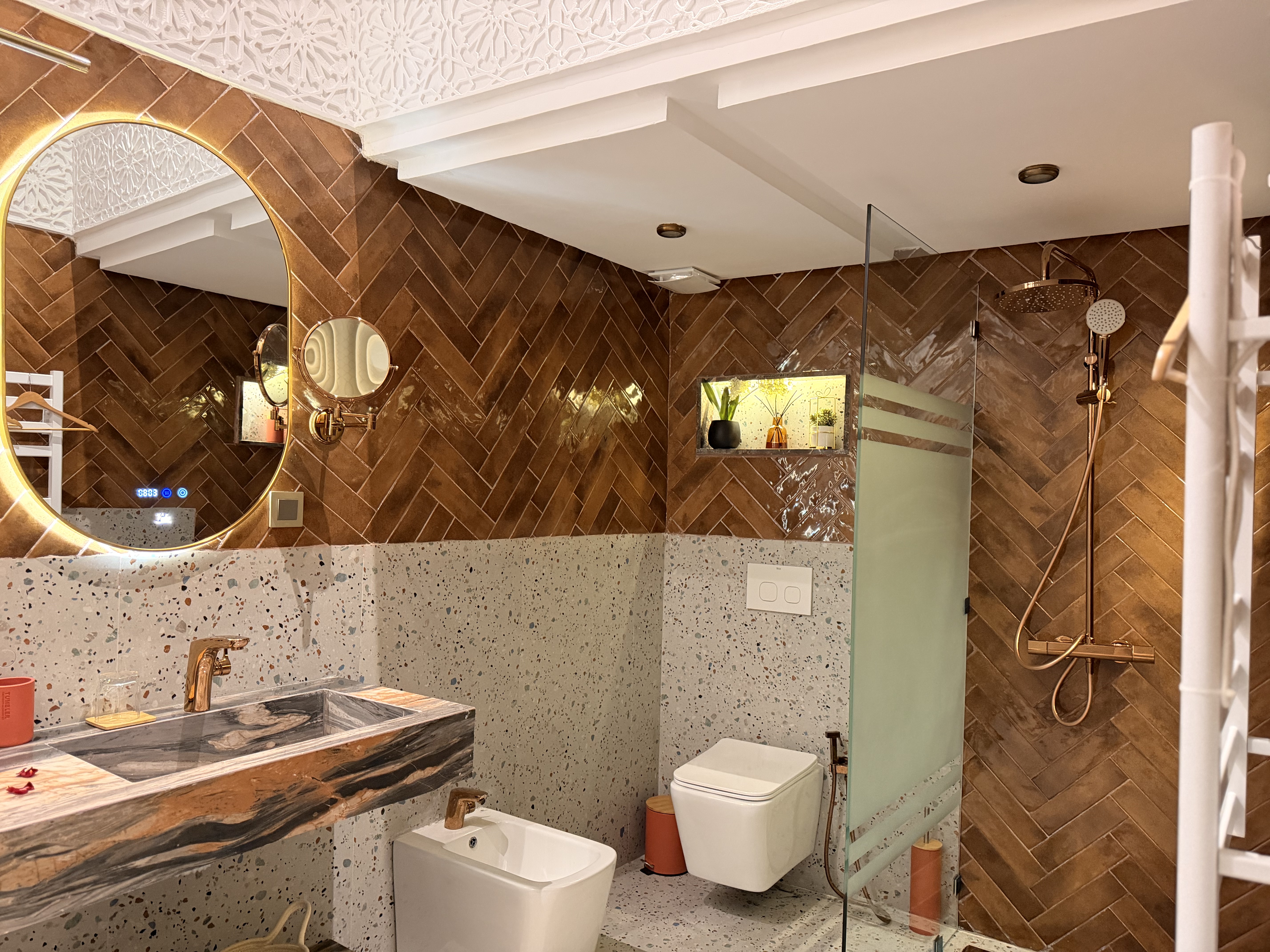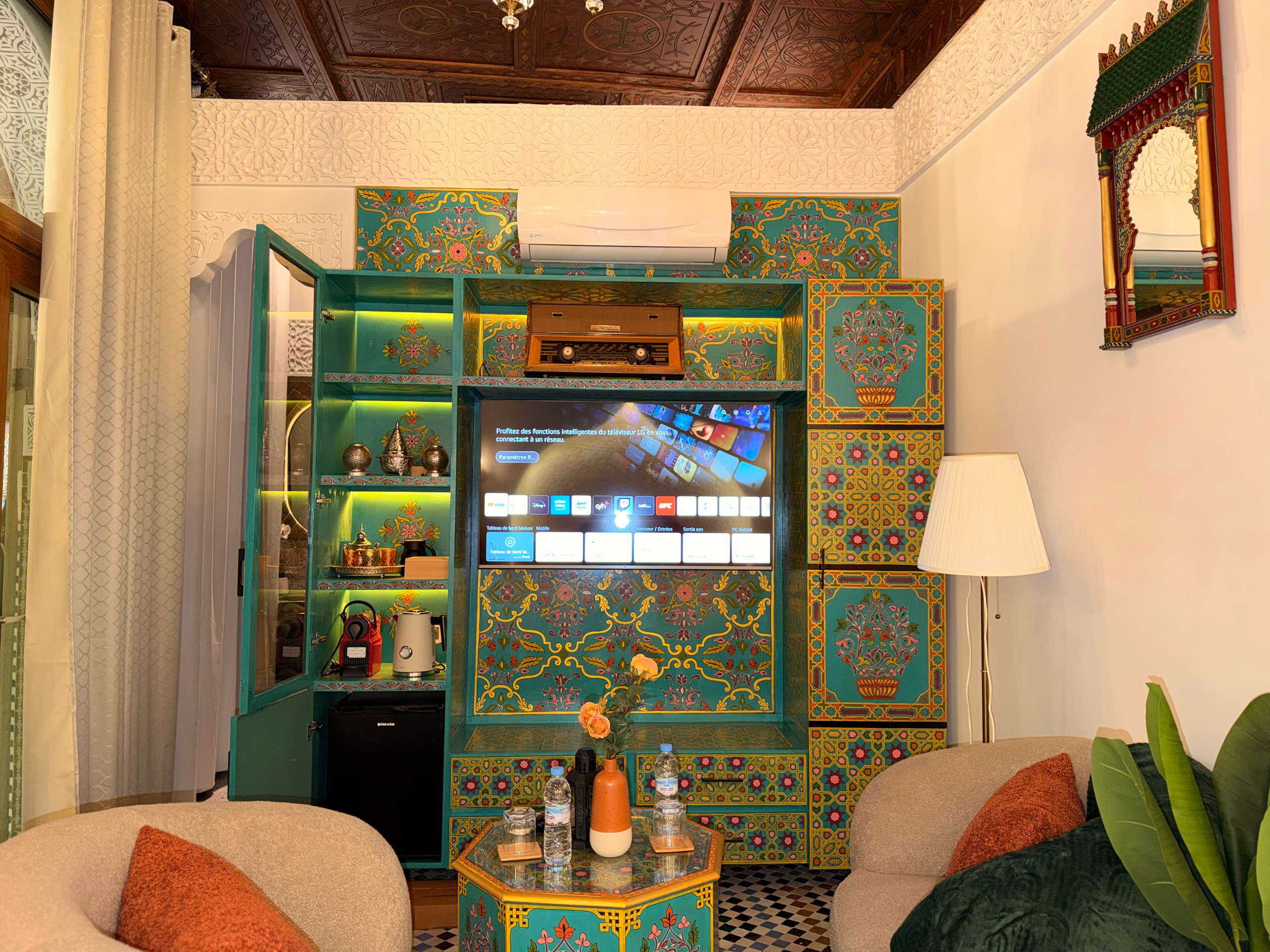 The walls are made of traditional plaster, the floors are covered with authentic Fez zellige, and the ceiling is crafted from oak wood decorated with Amazigh Berber motifs dating back to the 12th century